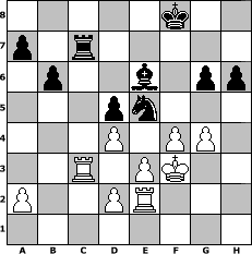 game notation in PGN-format [Event "Mit freude am Spiel 3"] [Site "www.myChess.de"] [Date "2021.09.09"] [Round "1"] [White "miu"] [Black "UPS"] [ECO "D53"] [WhitemyELO "1506"] [BlackmyELO "1684"] [Result "0-1"] [TimeControl "10/1728000"] [WhiteDays "20"] [BlackDays "20"] [MyChessNo "122917"] 1. d4 d5 2. c4 e6 3. Nc3 Nf6 4. Bg5 Be7 5. Nf3 c6 6. Rc1 h6 7. Bf4 O-O 8. cxd5 exd5 9. h3 Bf5 10. e3 Nbd7 11. Be2 Rc8 12. Qb3 Qb6 13. Qxb6 Nxb6 14. Nh4 Bh7 15. Bh2 c5 16. dxc5 Rxc5 17. O-O Rfc8 18. Rfd1 Ne4 19. Bg4 Nxc3 20. bxc3 Bxh4 21. Bxc8 Rxc8 22. Be5 Be7 23. Bd4 Bc5 24. f3 f5 25. Re1 Nc4 26. Kf2 Nb2 27. Ke2 Bxd4 28. cxd4 Nc4 29. f4 Kf8 30. Rb1 b6 31. Rb5 Bg8 32. g4 Nd6 33. Rb2 Be6 34. Kf3 Rc7 35. Re2 g6 36. Rc2 fxg4+ 37. hxg4 Nc4 38. Rc3 Ne5+ 0-1 position notation in FEN-format 5k2/p1r5/1p2b1pp/3pn3/3P1PP1/2R1PK2/P2PR3/8 - - - 3 39 Captured white pieces: ![]() ![]() ![]() ![]() ![]() ![]() ![]() ![]() ![]() ![]() ![]() ![]() ![]() ![]() ![]() Captured black pieces: ![]() ![]() ![]() ![]() ![]() ![]() ![]() ![]() ![]() ![]() ![]() ![]() ![]() ![]() ![]() Click on a captured piece in order to display the desired move!