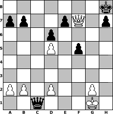 game notation in PGN-format [Event "2010 wird gut Teil II"] [Site "www.myChess.de"] [Date "2010.01.27"] [Round "1"] [White "werderfan"] [Black "Sanji"] [ECO "A56"] [WhitemyELO "1539"] [BlackmyELO "1582"] [Result "1/2-1/2"] [TimeControl "10/864000"] [WhiteDays "40"] [BlackDays "38"] [MyChessNo "62687"] 1. d4 Nf6 2. c4 c5 3. e3 cxd4 4. exd4 d6 5. Nc3 g6 6. Nf3 Bg7 7. Bd3 O-O 8. O-O Bg4 9. h3 Bxf3 10. Qxf3 Qc7 11. Bf4 Nh5 12. Be3 Nc6 13. Nd5 Qd7 14. Rfe1 Bxd4 15. Bxd4 Nxd4 16. Qe4 Ne6 17. f4 Nhg7 18. h4 f5 19. Qe3 Rf7 20. h5 gxh5 21. Be2 Nc7 22. Qg3 Nxd5 23. cxd5 Kh8 24. Rac1 Rg8 25. Qc3 Rff8 26. Bxh5 Rc8 27. Qh3 Nxh5 28. Qxh5 Rxc1 29. Rxc1 Rc8 30. Rxc8+ Qxc8 31. Qf7 Qc1+ 32. Kh2 Qxf4+ 33. Kg1 Qc1+ 1/2-1/2 position notation in FEN-format 7k/pp2pQ1p/3p4/3P1p2/8/8/PP1P2P1/2q3K1 - - - 2 34 Captured white pieces: Captured black pieces: Click on a captured piece in order to display the desired move!