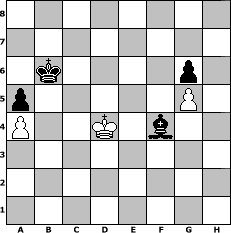 game notation in PGN-format [Event "Sp"] [Site "www.myChess.de"] [Date "2011.09.07"] [Round "1"] [White "Greenhorn"] [Black "reisender"] [ECO "C60"] [WhitemyELO "1504"] [BlackmyELO "1391"] [Result "0-1"] [TimeControl "10/1728000"] [WhiteDays "20"] [BlackDays "20"] [MyChessNo "76163"] 1. e4 e5 2. Nf3 Nc6 3. Bb5 Bd6 4. O-O Nge7 5. d4 O-O 6. Nxe5 Nxe5 7. dxe5 Bxe5 8. f4 c6 9. Bd3 Bd4+ 10. Kh1 d6 11. c3 Bf6 12. Nd2 Ng6 13. f5 Ne5 14. Be2 d5 15. exd5 cxd5 16. Nb3 b6 17. a4 Bb7 18. Nd4 a5 19. Bb5 Rc8 20. Be3 Bc6 21. Nxc6 Nxc6 22. Qg4 d4 23. Rad1 Qe7 24. cxd4 Qxe3 25. Rfe1 Qg5 26. Qxg5 Bxg5 27. d5 Na7 28. Ba6 Rcd8 29. Bb7 Bf6 30. b3 Rd7 31. Ba6 h6 32. g4 Rfd8 33. Bc4 Nc8 34. Re2 Nd6 35. Kg2 Nxc4 36. bxc4 Rc7 37. Rc1 Rdc8 38. Re4 Kf8 39. Kg3 Re7 40. Rce1 Rxc4 41. Rxc4 Rxe1 42. d6 Ke8 43. Rc6 Rd1 44. Rxb6 Be5+ 45. Kf3 Bxd6 46. h4 Bc7 47. Rb5 Ra1 48. Rc5 Kd7 49. Rc4 Ra3+ 50. Ke4 Rb3 51. Kd5 Rb4 52. g5 hxg5 53. hxg5 g6 54. fxg6 fxg6 55. Rd4 Rxd4+ 56. Kxd4 Kc6 57. Kc4 Kb6 58. Kd4 Bf4 0-1 position notation in FEN-format 8/8/1k4p1/p5P1/P2K1b2/8/8/8 - - - 5 59 Captured white pieces: Captured black pieces: Click on a captured piece in order to display the desired move!