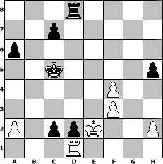 game notation in PGN-format [Event "Kleins Blitzel"] [Site "www.myChess.de"] [Date "2004.07.27"] [Round "1"] [White "Knight"] [Black "Master1"] [ECO "D01"] [WhitemyELO "1395"] [BlackmyELO "1329"] [Result "0-1"] [TimeControl "10/864000"] [WhiteDays "10"] [BlackDays "10"] [MyChessNo "5885"] 1. d4 d5 2. Nc3 Nc6 3. e4 e6 4. Bb5 Bd6 5. e5 a6 6. Bxc6+ bxc6 7. exd6 Qxd6 8. Nf3 Nf6 9. O-O Ne4 10. Ne5 c5 11. Qf3 Nf6 12. Bf4 Qb6 13. Bg5 cxd4 14. Bxf6 gxf6 15. Qxf6 Rf8 16. Nxd5 exd5 17. Nc6 Kd7 18. Ne5+ Ke8 19. Nc6 Kd7 20. Qe7+ Kxc6 21. Qxf8 Qxb2 22. Qxf7 h6 23. Qf6+ Kc5 24. Rfd1 h5 25. Rab1 Qc3 26. Rb3 Qc4 27. c3 d3 28. f4 Bg4 29. Qe7+ Kc6 30. Rdb1 Qc5+ 31. Qxc5+ Kxc5 32. Kf1 d2 33. c4 dxc4 34. Rf3 Bxf3 35. gxf3 Rd8 36. Rd1 c3 37. Ke2 c2 0-1 position notation in FEN-format 3r4/2p5/p7/2k4p/5P2/5P2/P1ppK2P/3R4 - - - 0 38 Captured white pieces: Captured black pieces: Click on a captured piece in order to display the desired move!