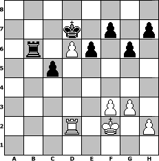 game notation in PGN-format [Event "Aprilwetterturnier"] [Site "www.myChess.de"] [Date "2016.06.04"] [Round "1"] [White "peter58"] [Black "Joschi"] [ECO "A56"] [WhitemyELO "1504"] [BlackmyELO "1510"] [Result "0-1"] [TimeControl "10/864000"] [WhiteDays "36"] [BlackDays "40"] [MyChessNo "103742"] 1. d4 Nf6 2. c4 c5 3. Nf3 g6 4. Nc3 cxd4 5. Nxd4 Nc6 6. Nxc6 bxc6 7. b4 Bg7 8. Rb1 O-O 9. e3 Rb8 10. a3 d6 11. Bd3 Be6 12. O-O Qc7 13. Bb2 Rfd8 14. Ne4 Nxe4 15. Bxe4 Bxb2 16. Rxb2 Bxc4 17. Re1 a5 18. Bd3 Bxd3 19. Qxd3 axb4 20. axb4 c5 21. Rc1 Qa7 22. Qc3 Rdc8 23. b5 Rb6 24. g3 Rcb8 25. Qc4 Qd7 26. Rcb1 e6 27. e4 Rc8 28. Rd1 Qb7 29. Kf1 Kf8 30. f3 Ke7 31. Kf2 Rb8 32. e5 Rxb5 33. exd6+ Kd7 34. Qa4 Qc6 35. Rxb5 Qxb5 36. Qxb5+ Rxb5 37. Rd2 Rb6 0-1 position notation in FEN-format 8/3k1p1p/1r1Pp1p1/2p5/8/5PP1/3R1K1P/8 - - - 2 38 Captured white pieces: Captured black pieces: Click on a captured piece in order to display the desired move!