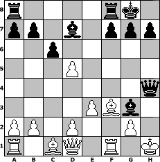 game notation in PGN-format [Event "Abtausch Variante"] [Site "www.myChess.de"] [Date "2007.02.05"] [Round "1"] [White "Knight"] [Black "Mike"] [ECO "D35"] [WhitemyELO "1283"] [BlackmyELO "1453"] [Result "0-1"] [TimeControl "10/1728000"] [WhiteDays "28"] [BlackDays "21"] [MyChessNo "32317"] 1. d4 d5 2. c4 e6 3. Nc3 Nf6 4. cxd5 exd5 5. Nf3 c6 6. e3 Bd6 7. Ne5 O-O 8. Be2 Nbd7 9. Nxd7 Bxd7 10. O-O Ne4 11. Nxe4 dxe4 12. f4 exf3 13. Bxf3 Qh4 14. d5 Bxh2+ 15. Kh1 Bg3+ 0-1 position notation in FEN-format r4rk1/pp1b1ppp/2p5/3P4/7q/4PBb1/PP1P2P1/R1BQ1R1K - - - 2 16 Captured white pieces: Captured black pieces: Click on a captured piece in order to display the desired move!