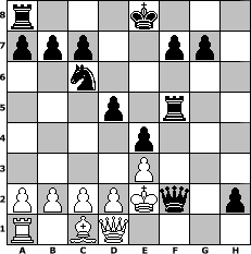 game notation in PGN-format [Event "Carpe Diem 2"] [Site "www.myChess.de"] [Date "2007.08.11"] [Round "2"] [White "MichaelKnopf"] [Black "muetoe"] [ECO "A00"] [WhitemyELO "1438"] [BlackmyELO "1715"] [Result "0-1"] [TimeControl "10/1728000"] [WhiteDays "51"] [BlackDays "59"] [MyChessNo "37270"] 1. g3 Nf6 2. Bg2 d5 3. e3 e5 4. Ne2 Be7 5. O-O Nc6 6. Nbc3 h5 7. h3 h4 8. g4 Bxg4 9. hxg4 h3 10. Bf3 e4 11. Bh1 h2+ 12. Kg2 Qd7 13. f3 Nxg4 14. fxg4 Qxg4+ 15. Ng3 Qh3+ 16. Kf2 Bh4 17. Nce2 Rh5 18. Bg2 Rf5+ 19. Ke1 Bxg3+ 20. Nxg3 Qxg3+ 21. Ke2 Qxg2+ 22. Rf2 Qxf2# 0-1 position notation in FEN-format r3k3/ppp2pp1/2n5/3p1r2/4p3/4P3/PPPPKq1p/R1BQ4 - q - 0 23 Captured white pieces: ![]() ![]() ![]() ![]() ![]() ![]() ![]() ![]() ![]() ![]() ![]() ![]() ![]() ![]() ![]() Captured black pieces: ![]() ![]() ![]() ![]() ![]() ![]() ![]() ![]() ![]() ![]() ![]() ![]() ![]() ![]() ![]() Click on a captured piece in order to display the desired move!