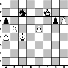game notation in PGN-format [Event "just for fun"] [Site "www.myChess.de"] [Date "2006.01.05"] [Round "2"] [White "schlachtross"] [Black "bane"] [ECO "D02"] [WhitemyELO "1514"] [BlackmyELO "1947"] [Result "1-0"] [TimeControl "10/2592000"] [WhiteDays "114"] [BlackDays "148"] [MyChessNo "21399"] 1. d4 d5 2. Nf3 c5 3. dxc5 Qa5+ 4. Nbd2 Qxc5 5. e3 Nf6 6. a3 Nbd7 7. c4 dxc4 8. Bxc4 Nb6 9. b4 Qd6 10. Bb3 Bg4 11. Bb2 Rc8 12. O-O e6 13. Qe2 a6 14. h3 Bxf3 15. Nxf3 Be7 16. Rfd1 Qb8 17. Bd4 Nbd7 18. e4 e5 19. Bb2 O-O 20. Nh4 Rfd8 21. Rac1 Rxc1 22. Rxc1 b5 23. Nf5 Bf8 24. Qe3 Qb6 25. Qxb6 Nxb6 26. Rc6 Nfd7 27. Nd6 Bxd6 28. Rxd6 Rb8 29. f4 exf4 30. Kf2 Kf8 31. h4 Ke7 32. Rc6 f6 33. Kf3 Rc8 34. Rxc8 Nxc8 35. Kxf4 Nd6 36. g4 Nc4 37. Bxc4 bxc4 38. Bd4 Ke6 39. a4 g6 40. g5 fxg5+ 41. hxg5 Nf8 42. Ke3 Kd7 43. Kd2 Ne6 44. Bf6 Nc7 45. Kc3 Ke6 46. Kxc4 h6 47. gxh6 Kxf6 48. e5+ Kf7 49. b5 1-0 position notation in FEN-format 8/2n2k2/p5pP/1P2P3/P1K5/8/8/8 - - - 0 49 Captured white pieces: Captured black pieces: Click on a captured piece in order to display the desired move!