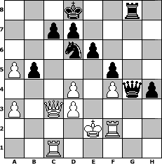 game notation in PGN-format [Event "April April April"] [Site "www.myChess.de"] [Date "2016.04.15"] [Round "1"] [White "Erich"] [Black "Peterlie77 (C)"] [Variant "Fischerrandom"] [SetUp "1"] [FEN "rqnnkrbb/pppppppp/8/8/8/8/PPPPPPPP/RQNNKRBB w KQkq - 0 1"] [WhitemyELO "2116"] [BlackmyELO "2108"] [Result "1/2-1/2"] [TimeControl "10/2592000"] [WhiteDays "90"] [BlackDays "81"] [MyChessNo "103292"] 1. e4 g6 2. c3 f5 3. exf5 gxf5 4. f4 Bd5 5. Ne3 Be4 6. d3 Bc6 7. Ne2 b5 8. Bf2 Ne6 9. Qc2 Nd6 10. Bh4 Qb7 11. Kf2 a5 12. Kg1 Rf7 13. a3 O-O-O 14. b4 Rg8 15. bxa5 Qa8 16. Ra2 Bf6 17. Bxf6 Rxf6 18. Qb3 Rfg6 19. Nd4 Nxd4 20. cxd4 e6 21. Rc2 h5 22. Qc3 h4 23. Kf2 Kd8 24. Rcc1 Bxg2 25. Nxg2 Rxg2+ 26. Bxg2 Qxg2+ 27. Ke1 Qxh2 28. Rf2 Qg3 29. Ke2 Qg4+ 1/2-1/2 position notation in FEN-format 3k2r1/2pp4/3np3/Pp3p2/3P1Pqp/P1QP4/4KR2/2R5 - - - 4 30 Captured white pieces: ![]() ![]() ![]() ![]() ![]() ![]() ![]() ![]() ![]() ![]() ![]() ![]() ![]() ![]() ![]() Captured black pieces: ![]() ![]() ![]() ![]() ![]() ![]() ![]() ![]() ![]() ![]() ![]() ![]() ![]() ![]() ![]() Click on a captured piece in order to display the desired move!