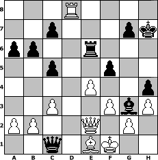game notation in PGN-format [Event "Eine zentrale Er"] [Site "www.myChess.de"] [Date "2009.05.20"] [Round "1"] [White "rkoelbach"] [Black "Andreas"] [ECO "C68"] [WhitemyELO "1481"] [BlackmyELO "1544"] [Result "0-1"] [TimeControl "10/2592000"] [WhiteDays "83"] [BlackDays "88"] [MyChessNo "55913"] 1. e4 e5 2. Nf3 Nc6 3. Bb5 a6 4. Bxc6 dxc6 5. O-O Bd6 6. d4 Bg4 7. dxe5 Bxf3 8. Qxf3 Bxe5 9. Rd1 Qf6 10. Qb3 b6 11. Nc3 Ne7 12. Be3 O-O 13. f3 c5 14. Nd5 Nxd5 15. Rxd5 h5 16. c3 h4 17. h3 Bf4 18. Bf2 Rad8 19. Rad1 Rxd5 20. Rxd5 Rd8 21. Qd1 Re8 22. Rd7 Bd6 23. Qd5 Qf4 24. Kf1 Re6 25. Rd8+ Kh7 26. Qd3 Qc1+ 27. Be1 Bg3 28. Qe2 f5 0-1 position notation in FEN-format 3R4/2p3pk/pp2r3/2p2p2/4P2p/2P2PbP/PP2Q1P1/2q1BK2 - - - 0 29 Captured white pieces: Captured black pieces: Click on a captured piece in order to display the desired move!