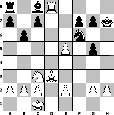 game notation in PGN-format [Event "unter uns Nr. 19 (Osterturnier)"] [Site "www.myChess.de"] [Date "2014.04.17"] [Round "1"] [White "Schefsche"] [Black "Knight"] [ECO "C21"] [WhitemyELO "1424"] [BlackmyELO "1203"] [Result "1-0"] [TimeControl "10/864000"] [WhiteDays "14"] [BlackDays "20"] [MyChessNo "93975"] 1. e4 e5 2. d4 exd4 3. Nf3 Nc6 4. Nxd4 Nxd4 5. Qxd4 d6 6. Bc4 Nf6 7. Bg5 Be7 8. e5 dxe5 9. Qxd8+ Bxd8 10. Nc3 O-O 11. O-O-O Re8 12. Rhe1 b6 13. f4 h6 14. Rxe5 Rxe5 15. fxe5 hxg5 16. Rxd8+ Kh7 17. Bd3+ 1-0 position notation in FEN-format r1bR4/p1p2ppk/1p3n2/4P1p1/8/2NB4/PPP1P1PP/2K5 - - - 2 17 Captured white pieces: Captured black pieces: Click on a captured piece in order to display the desired move!