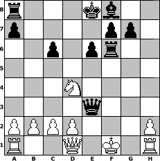 game notation in PGN-format [Event "Winterspiele"] [Site "www.myChess.de"] [Date "2008.12.29"] [Round "1"] [White "Knight"] [Black "bane"] [ECO "D00"] [WhitemyELO "1111"] [BlackmyELO "1806"] [Result "0-1"] [TimeControl "10/864000"] [WhiteDays "17"] [BlackDays "19"] [MyChessNo "51119"] 1. d4 d5 2. e4 dxe4 3. Nc3 Nf6 4. f3 Bf5 5. g4 Bg6 6. g5 Nd5 7. Nxe4 e6 8. Bb5+ c6 9. Ba4 h6 10. gxh6 Qh4+ 11. Kf1 Bxe4 12. fxe4 Qxe4 13. Nf3 Ne3+ 14. Bxe3 Qxe3 15. d5 Rxh6 16. dxc6 Nxc6 17. Bxc6+ bxc6 18. Nd4 Rf6+ 0-1 position notation in FEN-format r3kb2/p4pp1/2p1pr2/8/3N4/4q3/PPPP3P/R2Q1K1R - q - 2 19 Captured white pieces: Captured black pieces: Click on a captured piece in order to display the desired move!