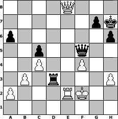 game notation in PGN-format [Event "Sommerschach 2009"] [Site "www.myChess.de"] [Date "2009.06.09"] [Round "1"] [White "Andreas"] [Black "Robert"] [ECO "B55"] [WhitemyELO "1541"] [BlackmyELO "1617"] [Result "1/2-1/2"] [TimeControl "10/864000"] [WhiteDays "10"] [BlackDays "03"] [MyChessNo "56463"] 1. e4 c5 2. Nf3 d6 3. d4 cxd4 4. Nxd4 Nf6 5. Bd3 a6 6. O-O Nc6 7. Nxc6 bxc6 8. Kh1 e6 9. Bg5 Be7 10. f4 Qc7 11. Nd2 Bb7 12. b3 O-O 13. c4 c5 14. Qe2 Rae8 15. Rae1 h6 16. Bh4 Nh7 17. Bxe7 Rxe7 18. e5 Rfe8 19. Bxh7+ Kxh7 20. Qd3+ Kg8 21. exd6 Qc6 22. Nf3 Rd7 23. Qe2 Rxd6 24. Ne5 Qc8 25. Qh5 Re7 26. h3 Rd2 27. Re2 Qd8 28. Rfe1 Rxe2 29. Qxe2 Qd4 30. Nd3 Rd7 31. Ne5 Rd8 32. Nxf7 Bxg2+ 33. Kxg2 Kxf7 34. Qxe6+ Kf8 35. Qe7+ Kg8 36. Qe6+ Kh8 37. Kf3 Qd3+ 38. Qe3 Qf5 39. Kg2 Qg6+ 40. Kf2 Qf5 41. Re2 Rd3 42. Qe8+ Kh7 1/2-1/2 position notation in FEN-format 4Q3/6pk/p6p/2p2q2/2P2P2/1P1r3P/P3RK2/8 - - - 17 43 Captured white pieces: Captured black pieces: Click on a captured piece in order to display the desired move!