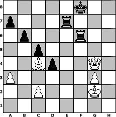 game notation in PGN-format [Event "Die Weinlese 2014 m. 50.00 Eu 1.Preis"] [Site "www.myChess.de"] [Date "2014.09.15"] [Round "1"] [White "Peterlie77 (C)"] [Black "espero"] [ECO "C15"] [WhitemyELO "2064"] [BlackmyELO "1738"] [Result "1-0"] [TimeControl "10/2592000"] [WhiteDays "28"] [BlackDays "25"] [MyChessNo "95927"] 1. e4 e6 2. d4 d5 3. Nc3 Bb4 4. a3 Bxc3+ 5. bxc3 dxe4 6. f3 b6 7. Nh3 Bb7 8. fxe4 Bxe4 9. Ng5 Bb7 10. Bb5+ c6 11. O-O Nf6 12. Bd3 c5 13. Qe1 Nbd7 14. Qg3 Rc8 15. d5 Bxd5 16. c4 Bc6 17. Nxh7 Qc7 18. Bf4 Qb7 19. Nxf6+ Nxf6 20. Rae1 Nh5 21. Qh4 Bxg2 22. Rxe6+ fxe6 23. Bg6+ Kf8 24. Rd1 Bd5 25. cxd5 exd5 26. Bxh5 Kg8 27. Rd3 d4 28. Be5 Rf8 29. Bxg7 Qxg7+ 30. Rg3 Rh7 31. Qh3 Rf6 32. Kg2 Qxg3+ 33. hxg3 Rc7 34. Be2 Re7 35. Qg4+ Kf8 36. Bc4 1-0 position notation in FEN-format 5k2/p3r3/1p3r2/2p5/2Bp2Q1/P5P1/2P3K1/8 - - - 6 36 Captured white pieces: Captured black pieces: Click on a captured piece in order to display the desired move!