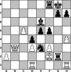 game notation in PGN-format [Event "Chess960 im M"] [Site "www.myChess.de"] [Date "2010.02.28"] [Round "2"] [White "Schefsche"] [Black "Robert"] [Variant "Fischerrandom"] [SetUp "1"] [FEN "nqbrkbnr/pppppppp/8/8/8/8/PPPPPPPP/NQBRKBNR w KQkq - 0 1"] [WhitemyELO "1409"] [BlackmyELO "1583"] [Result "0-1"] [TimeControl "10/1728000"] [WhiteDays "47"] [BlackDays "20"] [MyChessNo "63650"] 1. e4 c6 2. Bc4 Nf6 3. d3 d5 4. exd5 Qe5+ 5. Ne2 Nxd5 6. Bxd5 cxd5 7. Be3 Qh5 8. f3 e5 9. h4 f5 10. Bxa7 b6 11. Bb8 Bd6 12. Bxd6 Rxd6 13. c4 Nc7 14. b4 O-O 15. c5 bxc5 16. bxc5 Rg6 17. Kf2 d4 18. Ng3 Qh6 19. Qb8 Qe3+ 20. Kf1 Nd5 21. Qb3 Be6 22. Nc2 Rxg3 23. Nxe3 Nxe3+ 24. Kf2 Rxg2+ 0-1 position notation in FEN-format 5rk1/6pp/4b3/2P1pp2/3p3P/1Q1PnP2/P4Kr1/3R3R - - - 0 25 Captured white pieces: Captured black pieces: Click on a captured piece in order to display the desired move!