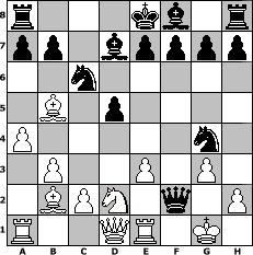 game notation in PGN-format [Event "> 1500"] [Site "www.myChess.de"] [Date "2010.03.18"] [Round "1"] [White "commander"] [Black "Whiskey40"] [ECO "D00"] [WhitemyELO "1172"] [BlackmyELO "1445"] [Result "0-1"] [TimeControl "10/2592000"] [WhiteDays "00"] [BlackDays "50"] [MyChessNo "64083"] 1. d4 d5 2. e3 Nf6 3. Nf3 c6 4. Ne5 Be6 5. a4 Qc7 6. b3 c5 7. dxc5 Qxc5 8. Ba3 Qc7 9. Bb5+ Bd7 10. O-O Qxe5 11. Nd2 Nc6 12. Re1 Ng4 13. g3 Qf6 14. Bb2 Qxf2+ 0-1 position notation in FEN-format r3kb1r/pp1bpppp/2n5/1B1p4/P5n1/1P2P1P1/1BPN1q1P/R2QR1K1 - kq - 0 15 Captured white pieces: Captured black pieces: Click on a captured piece in order to display the desired move!