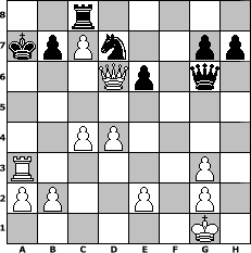 game notation in PGN-format [Event "Zwischendurch mal ein paar eigene Z"] [Site "www.myChess.de"] [Date "2008.04.30"] [Round "1"] [White "BobbyF4"] [Black "paul"] [ECO "C34"] [WhitemyELO "1625"] [BlackmyELO "1301"] [Result "1-0"] [TimeControl "10/1728000"] [WhiteDays "19"] [BlackDays "18"] [MyChessNo "44617"] 1. e4 e5 2. f4 exf4 3. Nf3 d6 4. Bc4 Be6 5. Bxe6 fxe6 6. d4 Be7 7. O-O Bg5 8. Nxg5 Qxg5 9. Bxf4 Qg6 10. Qf3 Nf6 11. e5 Ne4 12. Bg3 Qf5 13. Qe3 Qg4 14. c4 Nxg3 15. hxg3 Rf8 16. Nc3 Nd7 17. Nb5 Rxf1+ 18. Rxf1 O-O-O 19. Nxa7+ Kb8 20. exd6 Kxa7 21. dxc7 Rc8 22. Qa3+ Kb6 23. Qd6+ Ka7 24. Rf3 Qg6 25. Ra3# 1-0 position notation in FEN-format 2r5/kpPn2pp/3Qp1q1/8/2PP4/R5P1/PP2P1P1/6K1 - - - 8 25 Captured white pieces: Captured black pieces: Click on a captured piece in order to display the desired move!