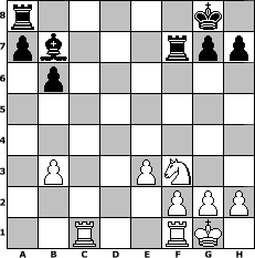 game notation in PGN-format [Event "Trauerspiel :-)"] [Site "www.myChess.de"] [Date "2008.09.20"] [Round "1"] [White "JerryWho"] [Black "thw"] [ECO "A40"] [WhitemyELO "1582"] [BlackmyELO "1521"] [Result "1/2-1/2"] [TimeControl "10/864000"] [WhiteDays "08"] [BlackDays "10"] [MyChessNo "48132"] 1. d4 e6 2. Nf3 c5 3. e3 d5 4. c4 Nf6 5. Nc3 Nc6 6. cxd5 Nxd5 7. Bc4 Nxc3 8. bxc3 cxd4 9. cxd4 Bb4+ 10. Bd2 Qa5 11. O-O O-O 12. Bxb4 Qxb4 13. Qb3 Qxb3 14. Bxb3 b6 15. Rac1 Bb7 16. d5 Na5 17. dxe6 Nxb3 18. exf7+ Rxf7 19. axb3 1/2-1/2 position notation in FEN-format r5k1/pb3rpp/1p6/8/8/1P2PN2/5PPP/2R2RK1 - - - 0 19 Captured white pieces: Captured black pieces: Click on a captured piece in order to display the desired move!