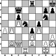 game notation in PGN-format [Event "Zwischendurch mal ein paar eigene Z"] [Site "www.myChess.de"] [Date "2009.02.11"] [Round "1"] [White "Seneca"] [Black "alpacino"] [ECO "A21"] [WhitemyELO "1398"] [BlackmyELO "1350"] [Result "0-1"] [TimeControl "10/1728000"] [WhiteDays "70"] [BlackDays "70"] [MyChessNo "52678"] 1. c4 e5 2. Nc3 c6 3. d3 Bc5 4. Nf3 f6 5. e3 Ne7 6. Be2 d6 7. O-O O-O 8. a3 Be6 9. b4 Bb6 10. a4 a6 11. Ne4 Ng6 12. Bb2 Nd7 13. Ba3 d5 14. Ng3 dxc4 15. dxc4 Re8 16. h3 Kh8 17. Ne4 Bc7 18. Qc2 Bd6 19. Nxd6 Nb6 20. Nxb7 Qc7 21. Nc5 Qe7 22. Nxe6 Qxe6 23. c5 Nd7 24. Bc4 Qe7 25. Nh2 e4 26. Rfd1 f5 27. Rd6 Nde5 28. Re6 Qc7 29. Rxe8+ Rxe8 30. Bxa6 Nh4 31. Be2 Nhg6 32. Rd1 Ne7 33. Bb2 N5g6 34. f4 Nd5 0-1 position notation in FEN-format 4r2k/2q3pp/2p3n1/2Pn1p2/PP2pP2/4P2P/1BQ1B1PN/3R2K1 - - - 1 35 Captured white pieces: Captured black pieces: Click on a captured piece in order to display the desired move!