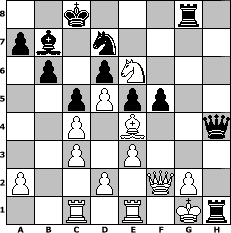 game notation in PGN-format [Event "Nimzo-Indisch"] [Site "www.myChess.de"] [Date "2011.10.17"] [Round "1"] [White "lasker"] [Black "Chaos"] [ECO "E21"] [WhitemyELO "1188"] [BlackmyELO "1833"] [Result "0-1"] [TimeControl "10/2592000"] [WhiteDays "37"] [BlackDays "72"] [MyChessNo "76926"] 1. d4 Nf6 2. c4 e6 3. Nc3 Bb4 4. Nf3 b6 5. Bg5 Bb7 6. e3 c5 7. Be2 h6 8. Bh4 g5 9. Bg3 g4 10. Ne5 Ne4 11. Qc2 d6 12. Nd3 f5 13. O-O Bxc3 14. bxc3 Nd7 15. Nf4 Qf6 16. Rac1 h5 17. h3 h4 18. Bh2 g3 19. fxg3 hxg3 20. Bxg3 Nxg3 21. Rfe1 O-O-O 22. Bd1 Ne4 23. Bf3 Rdg8 24. d5 e5 25. Ne6 Rxh3 26. Bxe4 Qh4 27. Qf2 Rh1# 0-1 position notation in FEN-format 2k3r1/pb1n4/1p1pN3/2pPpp2/2P1B2q/2P1P3/P2P1QP1/2R1R1Kr - - - 3 28 Captured white pieces: Captured black pieces: Click on a captured piece in order to display the desired move!