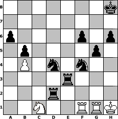 game notation in PGN-format [Event "Herbst 2017"] [Site "www.myChess.de"] [Date "2017.09.12"] [Round "1"] [White "Knight"] [Black "wolni55"] [ECO "D00"] [WhitemyELO "1190"] [BlackmyELO "1389"] [Result "0-1"] [TimeControl "10/2592000"] [WhiteDays "150"] [BlackDays "140"] [MyChessNo "109535"] 1. d4 d5 2. e4 dxe4 3. Nc3 Bf5 4. f3 e3 5. Bxe3 a6 6. g4 Bg6 7. Bg2 h6 8. h4 e6 9. h5 Bh7 10. Nge2 Nf6 11. Bf2 Nc6 12. f4 Rb8 13. O-O Nxg4 14. Bh3 Nf6 15. Kh1 Nxh5 16. Rg1 Bd6 17. d5 exd5 18. Nxd5 Ne7 19. Bh4 f6 20. c3 Be4+ 21. Bg2 Bxd5 22. Bxd5 Qd7 23. Qd3 Bxf4 24. Rae1 Be5 25. Bc4 Qxd3 26. Bxd3 g5 27. Bf2 O-O 28. Bh4 Kh8 29. Bf2 Rfd8 30. Nc1 Nf4 31. Bf1 Rd2 32. Bd4 Bxd4 33. cxd4 Nf5 34. b3 Nxd4 35. Bg2 c5 36. Ref1 b5 37. Be4 Re8 38. a3 Rxe4 39. b4 cxb4 40. axb4 Re3 0-1 position notation in FEN-format 7k/8/p4p1p/1p4p1/1P1n1n2/4r3/3r4/2N2RRK - - - 1 41 Captured white pieces: Captured black pieces: Click on a captured piece in order to display the desired move!