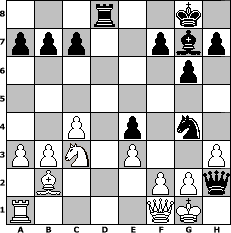 game notation in PGN-format [Event "Sommer 2015"] [Site "www.myChess.de"] [Date "2015.06.16"] [Round "1"] [White "FrankB"] [Black "Wernburger"] [ECO "A48"] [WhitemyELO "1694"] [BlackmyELO "1842"] [Result "0-1"] [TimeControl "10/1728000"] [WhiteDays "59"] [BlackDays "55"] [MyChessNo "99475"] 1. d4 Nf6 2. Nf3 g6 3. e3 Bg7 4. c4 O-O 5. Nc3 d6 6. h3 Nbd7 7. Bd3 Re8 8. O-O e5 9. dxe5 dxe5 10. Qc2 Nc5 11. Be2 Bf5 12. Qd2 Qe7 13. Rd1 Rad8 14. Qe1 Rxd1 15. Qxd1 Rd8 16. Qe1 Nd3 17. Bxd3 Bxd3 18. Nd2 Qb4 19. a3 Qd6 20. b3 e4 21. Nf1 Bxf1 22. Qxf1 Ng4 23. Bb2 Qh2# 0-1 position notation in FEN-format 3r2k1/ppp2pbp/6p1/8/2P1p1n1/PPN1P2P/1B3PPq/R4QK1 - - - 3 24 Captured white pieces: Captured black pieces: Click on a captured piece in order to display the desired move!