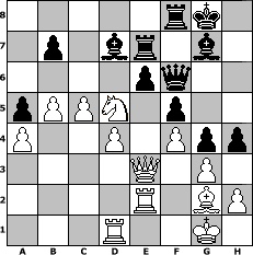 game notation in PGN-format [Event "Für die kalten Tage..."] [Site "www.myChess.de"] [Date "2018.02.09"] [Round "2"] [White "sprinterde"] [Black "FrankB"] [ECO "A45"] [WhitemyELO "1703"] [BlackmyELO "1706"] [Result "1-0"] [TimeControl "10/1728000"] [WhiteDays "20"] [BlackDays "17"] [MyChessNo "111364"] 1. d4 Nf6 2. g3 d5 3. Bg2 e6 4. Nf3 c5 5. Bg5 Be7 6. O-O Nc6 7. e3 Qb6 8. b3 O-O 9. Ne5 cxd4 10. Nxc6 Qxc6 11. exd4 Bd7 12. c4 Qb6 13. c5 Qd8 14. Re1 h6 15. Bf4 Bc6 16. Nc3 g5 17. Be5 Nd7 18. b4 Nxe5 19. Rxe5 Bf6 20. Re3 Bd7 21. Qd2 Bg7 22. Bf1 f5 23. Re2 Qf6 24. Rd1 Rae8 25. f4 g4 26. Bg2 a6 27. a4 h5 28. b5 Re7 29. Qd3 a5 30. Qe3 h4 31. Nxd5 1-0 position notation in FEN-format 5rk1/1p1br1b1/4pq2/pPPN1p2/P2P1Ppp/4Q1P1/4R1BP/3R2K1 - - - 0 31 Captured white pieces: Captured black pieces: Click on a captured piece in order to display the desired move!