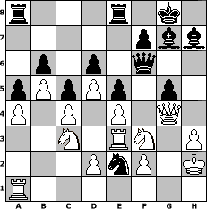game notation in PGN-format [Event "Albspiele 21"] [Site "www.myChess.de"] [Date "2012.05.10"] [Round "1"] [White "Knight"] [Black "Gauss1233"] [ECO "E90"] [WhitemyELO "1220"] [BlackmyELO "1277"] [Result "0-1"] [TimeControl "10/1728000"] [WhiteDays "00"] [BlackDays "19"] [MyChessNo "81657"] 1. d4 Nf6 2. c4 g6 3. Nc3 Bg7 4. e4 d6 5. Nf3 O-O 6. Bd3 c5 7. d5 Re8 8. O-O a6 9. Re1 e6 10. Bg5 e5 11. a3 Bg4 12. b4 h6 13. Bh4 Nbd7 14. b5 a5 15. Bxf6 Qxf6 16. Re3 b6 17. Be2 g5 18. h3 Bh5 19. g4 Bg6 20. a4 Nf8 21. Nh2 Bh7 22. Qf1 Ng6 23. Nf3 Nf4 24. Kh2 h5 25. Qg1 hxg4 26. Qxg4 Nxe2 0-1 position notation in FEN-format r3r1k1/5pbb/1p1p1q2/pPpPp1p1/P1P1P1Q1/2N1RN1P/3PnP1K/R7 - - - 0 27 Captured white pieces: Captured black pieces: Click on a captured piece in order to display the desired move!