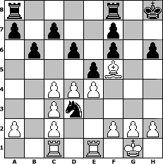 game notation in PGN-format [Event "9er5"] [Site "www.myChess.de"] [Date "2015.01.04"] [Round "1"] [White "Mattheus"] [Black "borsti"] [ECO "A21"] [WhitemyELO "1255"] [BlackmyELO "1325"] [Result "0-1"] [TimeControl "10/3456000"] [WhiteDays "40"] [BlackDays "40"] [MyChessNo "97425"] 1. c4 e5 2. Nc3 Bb4 3. e4 d6 4. Nf3 Bg4 5. Be2 Bxf3 6. Bxf3 Nf6 7. O-O O-O 8. d3 Bxc3 9. bxc3 Na6 10. Bg5 h6 11. Bh4 Nc5 12. Re1 Qd7 13. Rb1 b6 14. Bxf6 gxf6 15. Bg4 Qa4 16. Bf5 Qxd1 17. Rexd1 Kh8 18. d4 Na4 19. Rbc1 Nb2 20. Re1 Nd3 0-1 position notation in FEN-format r4r1k/p1p2p2/1p1p1p1p/4pB2/2PPP3/2Pn4/P1P2PPP/2R1R1K1 - - - 5 21 Captured white pieces: Captured black pieces: Click on a captured piece in order to display the desired move!
