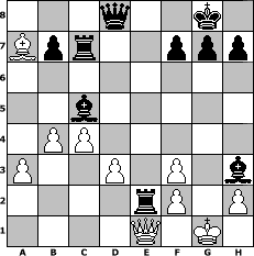 game notation in PGN-format [Event "Albspiele 4"] [Site "www.myChess.de"] [Date "2010.05.30"] [Round "1"] [White "Winston"] [Black "reisender"] [ECO "C41"] [WhitemyELO "1467"] [BlackmyELO "1416"] [Result "0-1"] [TimeControl "10/2592000"] [WhiteDays "30"] [BlackDays "30"] [MyChessNo "65862"] 1. e4 e5 2. Nf3 d6 3. Bc4 Nf6 4. d3 c6 5. a3 d5 6. exd5 cxd5 7. Ba2 Nc6 8. O-O Bg4 9. Re1 Bd6 10. Bg5 O-O 11. Bxd5 Rc8 12. Nc3 Nd4 13. b4 Rxc3 14. Ra2 Be7 15. Rxe5 Nxf3+ 16. gxf3 Bh3 17. Bc4 Rxc4 18. Qe1 Rc7 19. Re3 Nd5 20. c4 Nxe3 21. Bxe3 Re8 22. Bxa7 Bc5 23. Re2 Rxe2 0-1 position notation in FEN-format 3q2k1/Bpr2ppp/8/2b5/1PP5/P2P1P1b/4rP1P/4Q1K1 - - - 0 24 Captured white pieces: Captured black pieces: Click on a captured piece in order to display the desired move!