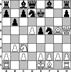 game notation in PGN-format [Event "Clubmeisterschaft der Oldies"] [Site "www.myChess.de"] [Date "2007.04.13"] [Round "1"] [White "countryman46"] [Black "elfranz"] [ECO "C41"] [WhitemyELO "1201"] [BlackmyELO "1508"] [Result "1-0"] [TimeControl "10/1728000"] [WhiteDays "35"] [BlackDays "39"] [MyChessNo "34089"] 1. e4 e5 2. Nf3 d6 3. d4 f6 4. Nc3 Ne7 5. b3 Nd7 6. Nh4 b6 7. Be3 g5 8. Nf5 d5 9. exd5 Nxf5 10. dxe5 fxe5 11. Qh5+ Ke7 12. Bxg5+ 1-0 position notation in FEN-format r1bq1b1r/p1pnk2p/1p6/3PpnBQ/8/1PN5/P1P1PPPP/R3KB1R - KQ - 0 12 Captured white pieces: Captured black pieces: Click on a captured piece in order to display the desired move!