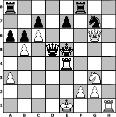 game notation in PGN-format [Event "Und wieder Aljechin...."] [Site "www.myChess.de"] [Date "2011.06.17"] [Round "1"] [White "sprinterde"] [Black "Greenhorn"] [ECO "B02"] [WhitemyELO "1656"] [BlackmyELO "1646"] [Result "1-0"] [TimeControl "10/2592000"] [WhiteDays "120"] [BlackDays "113"] [MyChessNo "74608"] 1. e4 Nf6 2. Nc3 d5 3. e5 d4 4. Nce2 Ne4 5. d3 Nc5 6. Nf3 Nc6 7. b4 Ne6 8. b5 Nb4 9. Bb2 g6 10. a3 Nd5 11. Nexd4 Bg7 12. Nxe6 Bxe6 13. c4 Nb6 14. Ng5 Bc8 15. c5 Nd5 16. Qa4 b6 17. h4 h6 18. Ne4 O-O 19. Rc1 Bd7 20. c6 Bc8 21. Ng3 Re8 22. h5 Be6 23. hxg6 fxg6 24. Qe4 Kh7 25. d4 Rf8 26. Bd3 Nf4 27. Bc4 Bxc4 28. Rxc4 Ne6 29. Bc1 a6 30. Bxh6 Bxh6 31. Qh4 Kg7 32. Qxh6+ Kf7 33. Qh7+ Ng7 34. d5 Qxd5 35. Rf4+ Ke6 36. Qxg6+ Kxe5 37. Re4+ 1-0 position notation in FEN-format r4r2/2p1p1n1/ppP3Q1/1P1qk3/4R3/P5N1/5PP1/4K2R - K - 1 37 Captured white pieces: Captured black pieces: Click on a captured piece in order to display the desired move!
