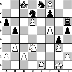 game notation in PGN-format [Event "Najdorf mit f4"] [Site "www.myChess.de"] [Date "2022.02.01"] [Round "2"] [White "Rotstift10"] [Black "kalle"] [ECO "B93"] [WhitemyELO "1599"] [BlackmyELO "1570"] [Result "1-0"] [TimeControl "10/2592000"] [WhiteDays "111"] [BlackDays "115"] [MyChessNo "124515"] 1. e4 c5 2. Nf3 d6 3. d4 cxd4 4. Nxd4 Nf6 5. Nc3 a6 6. f4 e5 7. Nf3 Nbd7 8. Bc4 b5 9. Bb3 Bb7 10. Bd5 Bxd5 11. exd5 e4 12. Qe2 Qe7 13. Nd4 Nb8 14. Nf5 Qc7 15. Nxe4 Be7 16. Nexd6+ Kf8 17. Qxe7+ Qxe7+ 18. Nxe7 Kxe7 19. Nf5+ Kf8 20. O-O g6 21. Ne3 Ne4 22. f5 Nd7 23. Rf4 Nd6 24. b3 Re8 25. Ba3 Ke7 26. Re1 g5 27. Re4+ Kd8 28. Rxe8+ Nxe8 29. Ng4 h5 30. Nf2 Nc7 31. Be7+ Kc8 32. d6 Ne8 33. Nd3 g4 34. g3 Rh6 35. Bf8 1-0 position notation in FEN-format 2k1nB2/3n1p2/p2P3r/1p3P1p/6p1/1P1N2P1/P1P4P/4R1K1 - - - 2 35 Captured white pieces: Captured black pieces: Click on a captured piece in order to display the desired move!