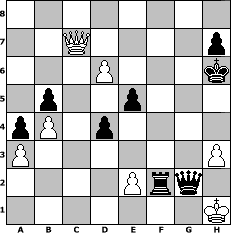 game notation in PGN-format [Event "Einfach nur Schach 4"] [Site "www.myChess.de"] [Date "2024.01.26"] [Round "2"] [White "Achimkogge"] [Black "borsti"] [ECO "C41"] [WhitemyELO "1320"] [BlackmyELO "1302"] [Result "0-1"] [TimeControl "10/864000"] [WhiteDays "37"] [BlackDays "40"] [MyChessNo "131482"] 1. e4 e5 2. Nf3 d6 3. c4 c5 4. Qa4+ Nc6 5. a3 Nf6 6. d3 Bd7 7. Bg5 Nd4 8. Qd1 Be7 9. Nxd4 cxd4 10. h3 Bc6 11. Nd2 O-O 12. b4 b5 13. g4 Nd7 14. Bxe7 Qxe7 15. Nf3 a5 16. Qb3 a4 17. Qc2 Rac8 18. Rb1 f6 19. Nh4 g6 20. Bg2 f5 21. gxf5 Qxh4 22. Qa2 Kg7 23. O-O gxf5 24. c5 fxe4 25. dxe4 Bxe4 26. Bxe4 Qxe4 27. cxd6 Rc2 28. Qe6 Qg6+ 29. Kh1 Rcxf2 30. Qxd7+ Kg8 31. Rxf2 Rxf2 32. Qc8+ Kg7 33. Qc7+ Kh6 34. Rg1 Qe4+ 35. Rg2 Qxg2# 0-1 position notation in FEN-format 8/2Q4p/3P3k/1p2p3/pP1p4/P6P/4Prq1/7K - - - 0 36 Captured white pieces: Captured black pieces: Click on a captured piece in order to display the desired move!