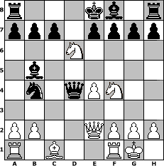 game notation in PGN-format [Event "wie w"] [Site "www.myChess.de"] [Date "2013.11.16"] [Round "1"] [White "Robur"] [Black "reisinger"] [ECO "D20"] [WhitemyELO "1806"] [BlackmyELO "1507"] [Result "1-0"] [TimeControl "10/1728000"] [WhiteDays "20"] [BlackDays "20"] [MyChessNo "91121"] 1. d4 d5 2. c4 dxc4 3. e4 Nc6 4. Bxc4 Qxd4 5. Qc2 Nf6 6. Nd2 Ng4 7. Nh3 Bd7 8. O-O Nge5 9. Nf4 Nxc4 10. Nxc4 Nb4 11. Qe2 Bb5 12. Nd6+ 1-0 position notation in FEN-format r3kb1r/ppp1pppp/3N4/1b6/1n1qPN2/8/PP2QPPP/R1B2RK1 - kq - 4 12 Captured white pieces: Captured black pieces: Click on a captured piece in order to display the desired move!