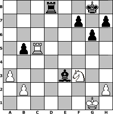 game notation in PGN-format [Event "3. HSF-Clubturnier - A-Finale"] [Site "www.myChess.de"] [Date "2013.03.16"] [Round "1"] [White "sprinterde"] [Black "leitsgeheier"] [ECO "B20"] [WhitemyELO "1669"] [BlackmyELO "1608"] [Result "0-1"] [TimeControl "10/2592000"] [WhiteDays "28"] [BlackDays "29"] [MyChessNo "87145"] 1. e4 c5 2. Bc4 d6 3. Nc3 Nf6 4. d3 g6 5. Nf3 Bg7 6. O-O O-O 7. Ng5 e6 8. Qf3 Nc6 9. Qe2 a6 10. Nf3 Na5 11. Bg5 Nxc4 12. dxc4 Qc7 13. Rab1 Bd7 14. Qd3 Bc6 15. Qe3 b5 16. cxb5 axb5 17. Bxf6 Bxf6 18. a3 Qb7 19. Nd2 d5 20. exd5 exd5 21. Qxc5 d4 22. Ne2 Bxg2 23. Rfe1 Rac8 24. Qb4 Rxc2 25. Nf4 Bh1 26. Rbc1 Rxc1 27. Rxc1 Bg5 28. f3 Bxf3 29. Qxd4 Rd8 30. Qe5 Qb6+ 31. Qc5 Qxc5+ 32. Rxc5 Bxf4 33. Nxf3 Be3+ 0-1 position notation in FEN-format 3r2k1/5p1p/6p1/1pR5/8/P3bN2/1P5P/6K1 - - - 1 34 Captured white pieces: ![]() ![]() ![]() ![]() ![]() ![]() ![]() ![]() ![]() ![]() ![]() ![]() ![]() ![]() ![]() Captured black pieces: ![]() ![]() ![]() ![]() ![]() ![]() ![]() ![]() ![]() ![]() ![]() ![]() ![]() ![]() ![]() Click on a captured piece in order to display the desired move!
