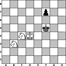 game notation in PGN-format [Event "Bremer Schl"] [Site "www.myChess.de"] [Date "2008.05.15"] [Round "1"] [White "deepsabel"] [Black "Phantasos"] [ECO "E91"] [WhitemyELO "1827"] [BlackmyELO "2151"] [Result "1/2-1/2"] [TimeControl "10/1728000"] [WhiteDays "103"] [BlackDays "061"] [MyChessNo "44901"] 1. d4 Nf6 2. c4 g6 3. Nc3 Bg7 4. e4 d6 5. Nf3 O-O 6. Be2 Na6 7. O-O e5 8. Re1 c6 9. Bf1 exd4 10. Nxd4 Nc5 11. Nb3 Qe7 12. Bg5 h6 13. Bf4 Rd8 14. f3 Ne6 15. Be3 h5 16. Qd2 h4 17. Rad1 Nh5 18. f4 Qf6 19. f5 gxf5 20. exf5 Qxf5 21. Bd3 Qg4 22. h3 Qg3 23. Bf2 Qg5 24. Qxg5 Nxg5 25. Bxh4 Bf6 26. Re3 Kg7 27. Rf1 Nxh3+ 28. Rxh3 Bxh3 29. Bxf6+ Nxf6 30. gxh3 d5 31. Kf2 Rh8 32. Rg1+ Kf8 33. Rg3 dxc4 34. Bxc4 Rd8 35. Rf3 Kg7 36. Bd3 Rh5 37. Nd2 Nd5 38. Nce4 Nf4 39. Bf1 Rf5 40. b3 Nd3+ 41. Bxd3 Rxf3+ 42. Nxf3 Rxd3 43. Nc5 Rc3 44. Nxb7 Rc2+ 45. Ke3 Rxa2 46. Nc5 a5 47. Nd4 Rh2 48. h4 Kg6 49. Nxc6 Rxh4 50. Nxa5 Kf5 51. Nc4 Rh3+ 52. Kd4 Rxb3 53. Nxb3 1/2-1/2 position notation in FEN-format 8/5p2/8/5k2/2NK4/1N6/8/8 - - - 0 53 Captured white pieces: Captured black pieces: Click on a captured piece in order to display the desired move!