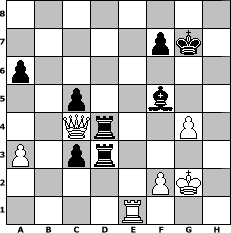 game notation in PGN-format [Event "Neue Reihe: sch"] [Site "www.myChess.de"] [Date "2009.05.15"] [Round "1"] [White "larlinde"] [Black "HenrySchinasky"] [ECO "C52"] [WhitemyELO "2219"] [BlackmyELO "2089"] [Result "1/2-1/2"] [TimeControl "10/2592000"] [WhiteDays "17"] [BlackDays "29"] [MyChessNo "55712"] 1. e4 e5 2. Nf3 Nc6 3. Bc4 Bc5 4. b4 Bxb4 5. c3 Ba5 6. d4 exd4 7. O-O Nf6 8. e5 d5 9. exf6 dxc4 10. fxg7 Rg8 11. Bg5 Qd5 12. Re1+ Be6 13. Nbd2 Rxg7 14. Ne4 Rg6 15. Nh4 Rxg5 16. Nf6+ Ke7 17. Nxd5+ Rxd5 18. Qb1 Kd6 19. cxd4 Bxe1 20. Qxe1 Rd8 21. Nf3 Kd7 22. Qe4 Kc8 23. Qxh7 Nxd4 24. Nxd4 c5 25. Qc2 Rxd4 26. g3 b5 27. h4 R8d5 28. Qe2 Kd8 29. h5 Ke7 30. Qf3 Rd3 31. Qe2 Kf8 32. h6 Kg8 33. Qb2 c3 34. Qxb5 Kh7 35. Qc4 Kxh6 36. Re1 Kg7 37. a3 a6 38. Kg2 Bf5 39. g4 R5d4 1/2-1/2 position notation in FEN-format 8/5pk1/p7/2p2b2/2Qr2P1/P1pr4/5PK1/4R3 - - - 1 40 Captured white pieces: ![]() ![]() ![]() ![]() ![]() ![]() ![]() ![]() ![]() ![]() ![]() ![]() ![]() ![]() ![]() Captured black pieces: ![]() ![]() ![]() ![]() ![]() ![]() ![]() ![]() ![]() ![]() ![]() ![]() ![]() ![]() ![]() Click on a captured piece in order to display the desired move!