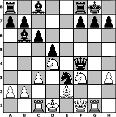 game notation in PGN-format [Event "Mailüfterl"] [Site "www.myChess.de"] [Date "2018.04.23"] [Round "1"] [White "Seneca"] [Black "sprinterde"] [ECO "A45"] [WhitemyELO "1508"] [BlackmyELO "1703"] [Result "0-1"] [TimeControl "10/1728000"] [WhiteDays "55"] [BlackDays "57"] [MyChessNo "112025"] 1. d4 Nf6 2. e3 d5 3. Nd2 Nc6 4. c3 e5 5. dxe5 Nxe5 6. f3 Bc5 7. Nb3 Bb6 8. Bb5+ c6 9. Be2 O-O 10. Nd4 Nh5 11. f4 Qh4+ 12. Kd2 Ng4 13. g3 Nxg3 14. Ngf3 Ne4+ 15. Kc2 Qe7 16. Qf1 Nef2 17. Rg1 Qe4+ 18. Kd2 Qxe3+ 19. Ke1 Nd3+ 20. Kd1 Nxc1 21. Rxc1 Qxf4 22. h3 Ne3+ 0-1 position notation in FEN-format r1b2rk1/pp3ppp/1bp5/3p4/3N1q2/2P1nN1P/PP2B3/2RK1QR1 - - - 1 23 Captured white pieces: Captured black pieces: Click on a captured piece in order to display the desired move!