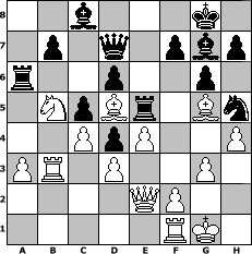 game notation in PGN-format [Event "Winter 2018"] [Site "www.myChess.de"] [Date "2018.01.10"] [Round "1"] [White "HenrySchinasky"] [Black "larlinde"] [ECO "A20"] [WhitemyELO "2126"] [BlackmyELO "2146"] [Result "1/2-1/2"] [TimeControl "10/2592000"] [WhiteDays "59"] [BlackDays "26"] [MyChessNo "110976"] 1. c4 e5 2. g3 d6 3. Nc3 c5 4. Bg2 Nc6 5. d3 g6 6. Nf3 Bg7 7. a3 a5 8. O-O Nge7 9. Ne1 O-O 10. Nc2 Nd4 11. Nxd4 exd4 12. Nb5 a4 13. Bf4 Ra6 14. Rb1 Nf5 15. Qd2 Be5 16. b4 axb3 17. Rxb3 Re8 18. Bd5 Bf6 19. h4 Re7 20. Qb2 Ng7 21. e4 Nh5 22. Bh6 Qd7 23. Qe2 Bg7 24. Bg5 Re5 1/2-1/2 position notation in FEN-format 2b3k1/1p1q1pbp/r2p2p1/1NpBr1Bn/2PpP2P/PR1P2P1/4QP2/5RK1 - - - 7 25 Captured white pieces: Captured black pieces: Click on a captured piece in order to display the desired move!