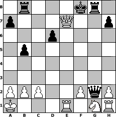 game notation in PGN-format [Event "> 1500"] [Site "www.myChess.de"] [Date "2010.03.18"] [Round "1"] [White "rux"] [Black "Caligula"] [ECO "A22"] [WhitemyELO "1460"] [BlackmyELO "1318"] [Result "1-0"] [TimeControl "10/2592000"] [WhiteDays "89"] [BlackDays "90"] [MyChessNo "64093"] 1. c4 e5 2. Nc3 Nf6 3. e4 c6 4. d4 exd4 5. Qxd4 c5 6. Qe5+ Be7 7. Nd5 d6 8. Nxf6+ gxf6 9. Qg3 Kf8 10. Bh6+ Ke8 11. Qg7 Kd7 12. O-O-O Nc6 13. Qxf7 Ne5 14. Qd5 Rb8 15. Qxc5 Ke8 16. Qd5 b6 17. Qb5+ Bd7 18. Qd5 Qc8 19. Qd4 Nxc4 20. Bxc4 b5 21. Bg7 Rg8 22. Bxf6 Bxf6 23. Qxf6 Qxc4+ 24. Kb1 Qxe4+ 25. Ka1 Qxg2 26. Re1+ Be6 27. Qxe6+ Kf8 28. Qe7# 1-0 position notation in FEN-format 1r3kr1/p3Q2p/3p4/1p6/8/8/PPP2PqP/K3R1NR - - - 2 28 Captured white pieces: Captured black pieces: Click on a captured piece in order to display the desired move!