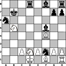 game notation in PGN-format [Event "Der Beste hinter den 1900ern(1/10) oder 10 hoch 2"] [Site "www.myChess.de"] [Date "2009.07.09"] [Round "1"] [White "Knight"] [Black "BobbyF4"] [ECO "C40"] [WhitemyELO "1168"] [BlackmyELO "1567"] [Result "0-1"] [TimeControl "10/864000"] [WhiteDays "10"] [BlackDays "10"] [MyChessNo "57304"] 1. e4 e5 2. Nf3 f5 3. exf5 e4 4. Nd4 Nf6 5. Nc3 c5 6. Ndb5 a6 7. Na3 b5 8. Nab1 d5 9. a3 Bxf5 10. d3 e3 11. fxe3 Nc6 12. e4 dxe4 13. dxe4 Qxd1+ 14. Kxd1 Bxe4 15. Bf4 O-O-O+ 16. Nd2 Bf5 17. b4 cxb4 18. axb4 Nxb4 19. Rxa6 Nxa6 20. Nxb5 Ne4 21. Na7+ Kb7 22. Nb5 Nf2+ 0-1 position notation in FEN-format 3r1b1r/1k4pp/n7/1N3b2/5B2/8/2PNPnPP/3K1B1R - - - 5 23 Captured white pieces: Captured black pieces: Click on a captured piece in order to display the desired move!