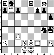 game notation in PGN-format [Event "unter uns Nr. 24"] [Site "www.myChess.de"] [Date "2014.11.15"] [Round "1"] [White "Mattheus"] [Black "Schefsche"] [ECO "C26"] [WhitemyELO "1259"] [BlackmyELO "1326"] [Result "0-1"] [TimeControl "10/864000"] [WhiteDays "30"] [BlackDays "18"] [MyChessNo "96733"] 1. e4 e5 2. Nc3 Nf6 3. Nf3 Bb4 4. d3 Bxc3+ 5. bxc3 O-O 6. Nxe5 d6 7. Nc4 Re8 8. Bg5 h6 9. Bd2 d5 10. Nb2 dxe4 11. Be2 exd3 12. Nxd3 Bg4 13. f3 Bf5 14. g4 Bxd3 15. cxd3 Qxd3 16. Rb1 Qxf3 17. Rf1 Qxg4 18. Rxb7 Qh4+ 19. Rf2 Ng4 0-1 position notation in FEN-format rn2r1k1/pRp2pp1/7p/8/6nq/2P5/P2BBR1P/3QK3 - - - 3 20 Captured white pieces: Captured black pieces: Click on a captured piece in order to display the desired move!