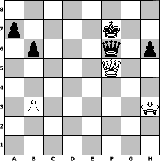 game notation in PGN-format [Event "Februar 2018"] [Site "www.myChess.de"] [Date "2018.02.03"] [Round "1"] [White "muellerh"] [Black "Naunhofer"] [ECO "B20"] [WhitemyELO "1479"] [BlackmyELO "1612"] [Result "1/2-1/2"] [TimeControl "10/1728000"] [WhiteDays "82"] [BlackDays "99"] [MyChessNo "111260"] 1. e4 c5 2. d4 cxd4 3. Nf3 e5 4. Bd2 d6 5. c3 dxc3 6. Bxc3 Nf6 7. Bd3 Be7 8. O-O O-O 9. Nbd2 Nc6 10. Nc4 Be6 11. b3 Rc8 12. Ng5 Qd7 13. Qd2 Bg4 14. h3 Bh5 15. Rfe1 h6 16. g4 Bxg4 17. Nxf7 Bxh3 18. Nxh6+ gxh6 19. Be2 Kh7 20. f4 Nxe4 21. Bd3 Qg4+ 22. Kh2 d5 23. Nxe5 Nxe5 24. Bxe5 Bc5 25. Rg1 Bxg1+ 26. Rxg1 Bg2 27. Rxg2 Qh4+ 28. Kg1 Rf7 29. Qe3 Rf6 30. Bxe4+ dxe4 31. Qxe4+ Kh8 32. Bxf6+ Qxf6 33. Qe3 b6 34. f5 Rg8 35. Rxg8+ Kxg8 36. Qf2 Kf7 37. Qf3 Qa1+ 38. Kg2 Qxa2+ 39. Kg3 Qd2 40. Kg4 Qg5+ 41. Kh3 Kf6 42. Qc6+ Kxf5 43. Qd5+ Kf6 44. Qd6+ Kf7 45. Qd7+ Qe7 46. Qf5+ Qf6 1/2-1/2 position notation in FEN-format 8/p4k2/1p3q1p/5Q2/8/1P5K/8/8 - - - 8 47 Captured white pieces: Captured black pieces: Click on a captured piece in order to display the desired move!