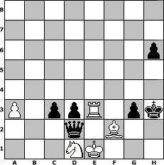game notation in PGN-format [Event "Sebastian Kneip 960er-Turnier 2014"] [Site "www.myChess.de"] [Date "2014.05.17"] [Round "1"] [White "Seneca"] [Black "Achimkogge"] [Variant "Fischerrandom"] [SetUp "1"] [FEN "bnqbnrkr/pppppppp/8/8/8/8/PPPPPPPP/BNQBNRKR w KQkq - 0 1"] [WhitemyELO "1547"] [BlackmyELO "1425"] [Result "0-1"] [TimeControl "10/3456000"] [WhiteDays "37"] [BlackDays "40"] [MyChessNo "94460"] 1. b3 c5 2. e4 f6 3. Nf3 d6 4. c3 b6 5. Be2 Bxe4 6. d3 Bb7 7. Nbd2 g5 8. Re1 Ng7 9. d4 Nf5 10. dxc5 bxc5 11. Bc4+ d5 12. Bd3 Nc6 13. c4 Nb4 14. Bb1 d4 15. h3 h6 16. a3 Nc6 17. Qc2 e6 18. Ne4 Be7 19. Qd2 Rd8 20. Qd3 Ne5 21. Qd1 Qc7 22. Nxe5 fxe5 23. Ng3 Nh4 24. Be4 Bc6 25. Qd3 Qb7 26. Bxc6 Qxc6 27. f3 O-O 28. Ne4 Rf4 29. Bb2 Rdf8 30. Bc1 Nxf3+ 31. gxf3 Rxf3 32. Qe2 d3 33. Qg2 Rf1+ 34. Rxf1 Rxf1+ 35. Kxf1 Qe8 36. Qf2 Qc6 37. Qf3 Qd7 38. Bd2 Kg7 39. Rg1 Qd4 40. h4 Qa1+ 41. Kg2 Qb2 42. Rf1 Kh8 43. Qf7 Bd6 44. Qf8+ Bxf8 45. Rxf8+ Kg7 46. Rf6 Qxb3 47. Rxe6 Qd1 48. Rxe5 Qg4+ 49. Kf1 Qxh4 50. Nf2 Qxc4 51. Re7+ Kg6 52. Rxa7 Qc2 53. Ke1 c4 54. Rc7 Qb1+ 55. Nd1 Qb3 56. Bb4 Kh5 57. Re7 Qc2 58. Re5 Kh4 59. Re3 g4 60. Be7+ Kh5 61. Bc5 c3 62. Re5+ Kh4 63. Bf2+ g3 64. Re4+ Kh3 65. Re3 Qd2+ 0-1 position notation in FEN-format 8/8/7p/8/8/P1ppR1pk/3q1B2/3NK3 - - - 4 66 Captured white pieces: Captured black pieces: Click on a captured piece in order to display the desired move!