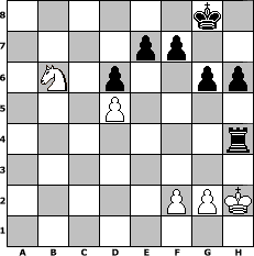 game notation in PGN-format [Event "YOUR LAST BREATH"] [Site "www.myChess.de"] [Date "2019.11.17"] [Round "2"] [White "martinus"] [Black "Joschi"] [ECO "A57"] [WhitemyELO "1718"] [BlackmyELO "1531"] [Result "0-1"] [TimeControl "10/3456000"] [WhiteDays "40"] [BlackDays "40"] [MyChessNo "116362"] 1. d4 Nf6 2. c4 c5 3. d5 b5 4. cxb5 a6 5. Nc3 d6 6. e4 axb5 7. Bxb5+ Bd7 8. Qd3 g6 9. Nf3 Bg7 10. O-O Bxb5 11. Qxb5+ Nbd7 12. Re1 O-O 13. Qd3 Qb6 14. b3 Ra7 15. e5 Ne8 16. Nb5 Rb7 17. a4 Nc7 18. Nxc7 Rxc7 19. e6 Bxa1 20. exd7 Rxd7 21. Bh6 Bg7 22. Bxg7 Kxg7 23. Ng5 h6 24. Ne4 Rb8 25. Rb1 Qb4 26. h4 c4 27. Qd4+ Kg8 28. Nd2 c3 29. Qxb4 Rxb4 30. Nc4 Rdb7 31. Na5 R7b6 32. Rc1 Ra6 33. Nc6 Rxb3 34. Nd4 Rb4 35. Nb5 Raxa4 36. Nxc3 Rc4 37. Nxa4 Rxc1+ 38. Kh2 Rc4 39. Nb6 Rxh4+ 0-1 position notation in FEN-format 6k1/4pp2/1N1p2pp/3P4/7r/8/5PPK/8 - - - 0 40 Captured white pieces: Captured black pieces: Click on a captured piece in order to display the desired move!