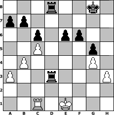game notation in PGN-format [Event "Trauerspiel :-)"] [Site "www.myChess.de"] [Date "2008.09.20"] [Round "1"] [White "Master1"] [Black "murphy12"] [ECO "A51"] [WhitemyELO "1262"] [BlackmyELO "1524"] [Result "0-1"] [TimeControl "10/864000"] [WhiteDays "06"] [BlackDays "10"] [MyChessNo "48127"] 1. d4 Nf6 2. c4 e5 3. Nc3 exd4 4. Qxd4 Nc6 5. Qh4 Be7 6. Bg5 O-O 7. e3 d6 8. Bd3 h6 9. Nge2 Ne5 10. Nd5 Nxd3+ 11. Kd2 hxg5 12. Qd4 Nxf2 13. Rhf1 N6e4+ 14. Ke1 c6 15. Nxe7+ Qxe7 16. Rxf2 Nxf2 17. Kxf2 Qf6+ 18. Qxf6 gxf6 19. b4 Be6 20. Rc1 Rad8 21. Nd4 Rfe8 22. Nxe6 fxe6 23. g4 d5 24. c5 d4 25. exd4 Rxd4 26. a3 Red8 27. h3 Rd2+ 28. Ke1 R2d3 0-1 position notation in FEN-format 3r2k1/pp6/2p1pp2/2P3p1/1P4P1/P2r3P/8/2R1K3 - - - 3 29 Captured white pieces: Captured black pieces: Click on a captured piece in order to display the desired move!
