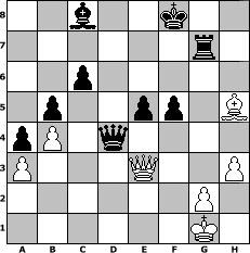 game notation in PGN-format [Event "Februar 2018"] [Site "www.myChess.de"] [Date "2018.02.03"] [Round "1"] [White "reisinger"] [Black "Seneca"] [ECO "A42"] [WhitemyELO "1456"] [BlackmyELO "1426"] [Result "0-1"] [TimeControl "10/1728000"] [WhiteDays "99"] [BlackDays "58"] [MyChessNo "111251"] 1. d4 d6 2. c4 Nf6 3. Nc3 g6 4. Bf4 Bg7 5. e4 c6 6. Be2 O-O 7. h3 a6 8. Qd2 b5 9. a3 Bb7 10. Nf3 Nbd7 11. Bh6 Nb6 12. Rd1 Qd7 13. Bxg7 Kxg7 14. e5 dxe5 15. Nxe5 Qc7 16. O-O Nbd7 17. Nxd7 Qxd7 18. c5 e6 19. Rfe1 Nd5 20. Ne4 a5 21. Bg4 a4 22. Nc3 Qd8 23. b4 h6 24. f4 Qc7 25. Re5 Rad8 26. Ne2 Bc8 27. Ng3 Rde8 28. Rde1 Ne7 29. Nh1 Nd5 30. Nf2 Re7 31. Bf3 Rfe8 32. Ng4 h5 33. Nf2 Nf6 34. Qd3 Rd8 35. Rg5 Qxf4 36. Ree5 Rxd4 37. Qc2 Nh7 38. Rxh5 gxh5 39. Rxh5 Nf6 40. Ne4 Nxh5 41. Nd6 Rxd6 42. cxd6 Qxd6 43. Bxh5 f5 44. Qc3+ e5 45. Qg3+ Kf8 46. Qg5 Rg7 47. Qe3 Qd4 0-1 position notation in FEN-format 2b2k2/6r1/2p5/1p2pp1B/pP1q4/P3Q2P/6P1/6K1 - - - 6 48 Captured white pieces: Captured black pieces: Click on a captured piece in order to display the desired move!