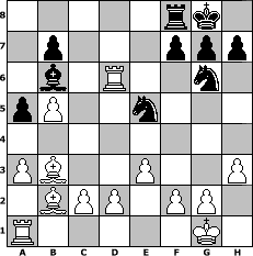 game notation in PGN-format [Event "wie w"] [Site "www.myChess.de"] [Date "2013.11.16"] [Round "1"] [White "reisinger"] [Black "Knight"] [ECO "A40"] [WhitemyELO "1507"] [BlackmyELO "1189"] [Result "1-0"] [TimeControl "10/1728000"] [WhiteDays "20"] [BlackDays "20"] [MyChessNo "91155"] 1. d4 e5 2. dxe5 Nc6 3. Nf3 Bc5 4. e3 Nge7 5. Nc3 O-O 6. Bc4 d6 7. exd6 cxd6 8. a3 Bg4 9. b4 Bb6 10. h3 Bxf3 11. Qxf3 Ng6 12. O-O a5 13. b5 Nce7 14. Bb2 Rc8 15. Bb3 Ne5 16. Qe4 Rc7 17. Rfd1 N7g6 18. Nd5 Ba7 19. Nxc7 Qxc7 20. Qd5 Bb6 21. Qxd6 Qxd6 22. Rxd6 1-0 position notation in FEN-format 5rk1/1p3ppp/1b1R2n1/pP2n3/8/PB2P2P/1BPP1PP1/R5K1 - - - 0 22 Captured white pieces: Captured black pieces: Click on a captured piece in order to display the desired move!