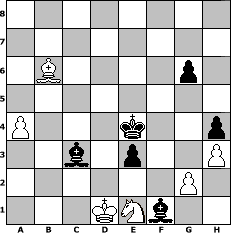 game notation in PGN-format [Event "Martins Weinprobe Open"] [Site "www.myChess.de"] [Date "2010.10.19"] [Round "1"] [White "martinus"] [Black "kischok46"] [ECO "E21"] [WhitemyELO "1753"] [BlackmyELO "2021"] [Result "0-1"] [TimeControl "10/1728000"] [WhiteDays "17"] [BlackDays "20"] [MyChessNo "69174"] 1. d4 Nf6 2. c4 e6 3. Nc3 Bb4 4. Nf3 O-O 5. e3 d5 6. Bd3 b6 7. O-O dxc4 8. Bxc4 Bb7 9. Bd2 Nbd7 10. Rc1 Bd6 11. Nb5 Be7 12. Bd3 c5 13. Qe2 a6 14. Nc3 b5 15. a3 Qb6 16. dxc5 Nxc5 17. Bc2 Nce4 18. Nxe4 Nxe4 19. Bxe4 Bxe4 20. Ne5 Rad8 21. f3 Bd5 22. Qe1 Qa7 23. Ba5 Rc8 24. Bc3 f6 25. Bd4 Qb7 26. Rxc8 Rxc8 27. Nd3 e5 28. Bc3 Bc4 29. Qb1 Rd8 30. Rd1 Qb6 31. Nb4 Qxe3+ 32. Kh1 h5 33. Rxd8+ Bxd8 34. Nxa6 Bb6 35. Qe1 h4 36. Qxe3 Bxe3 37. h3 Kf7 38. Nb4 g6 39. Nc2 Bg5 40. Kg1 Bd3 41. Nb4 Be3+ 42. Kh1 Be2 43. Nc2 Bc1 44. Kg1 Bd3 45. Nb4 Bc4 46. Kf2 Ke6 47. Nc2 f5 48. Ne3 Bd3 49. Nf1 Bg5 50. Bd2 Be7 51. Bc3 Bc5+ 52. Ke1 Kd5 53. Nd2 Bg1 54. b3 Bd4 55. Bb4 e4 56. fxe4+ fxe4 57. a4 bxa4 58. bxa4 e3 59. Nf3 Bf6 60. Ba5 Bc2 61. Bb6 Ke4 62. Ke2 Bd3+ 63. Kd1 Bf1 64. Ne1 Bc3 0-1 position notation in FEN-format 8/8/1B4p1/8/P3k2p/2b1p2P/6P1/3KNb2 - - - 12 65 Captured white pieces: Captured black pieces: Click on a captured piece in order to display the desired move!