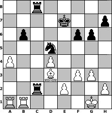 game notation in PGN-format [Event "Ohne techn. Hilfsmittel..."] [Site "www.myChess.de"] [Date "2013.02.13"] [Round "1"] [White "Stoertebecker"] [Black "Naunhofer"] [ECO "B50"] [WhitemyELO "1773"] [BlackmyELO "1667"] [Result "1/2-1/2"] [TimeControl "10/864000"] [WhiteDays "26"] [BlackDays "30"] [MyChessNo "86537"] 1. e4 c5 2. Nf3 d6 3. c3 Nc6 4. d4 cxd4 5. cxd4 Bg4 6. Nc3 Bxf3 7. gxf3 e6 8. Be3 d5 9. a3 Nge7 10. Qb3 g6 11. Qxb7 Rb8 12. Qa6 Rxb2 13. Bb5 Qb6 14. Qxb6 axb6 15. exd5 exd5 16. Nxd5 Kd8 17. Nxe7 Nxe7 18. a4 Nd5 19. O-O Bd6 20. Rfb1 Rc2 21. Bg5+ f6 22. Bh4 Ke7 23. Bg3 Bxg3 24. fxg3 Rhc8 25. Bd3 1/2-1/2 position notation in FEN-format 2r5/4k2p/1p3pp1/3n4/P2P4/3B1PP1/2r1P2P/RR4K1 - - - 2 25 Captured white pieces: Captured black pieces: Click on a captured piece in order to display the desired move!