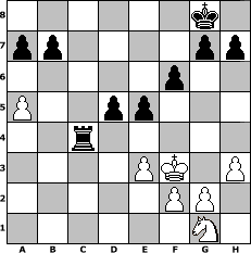 game notation in PGN-format [Event "Sommerschach"] [Site "www.myChess.de"] [Date "2018.05.26"] [Round "1"] [White "lotchi"] [Black "FrankB"] [ECO "A06"] [WhitemyELO "1068"] [BlackmyELO "1641"] [Result "0-1"] [TimeControl "10/2592000"] [WhiteDays "27"] [BlackDays "29"] [MyChessNo "112211"] 1. Nf3 d5 2. d4 Nf6 3. Nc3 e6 4. Bg5 Be7 5. Bxf6 Bxf6 6. e3 c5 7. dxc5 Bxc3+ 8. bxc3 O-O 9. a4 Qa5 10. Qd2 Qxc5 11. Bb5 Bd7 12. Bxd7 Nxd7 13. Qd4 Rfc8 14. Qxc5 Rxc5 15. Ra3 Rac8 16. Kd2 f6 17. h3 Nb6 18. a5 Nc4+ 19. Ke2 Nxa3 20. c4 Rxc4 21. Nd4 e5 22. Nb3 Rxc2+ 23. Kf3 R8c3 24. Na1 Rc1 25. Rxc1 Rxc1 26. Nb3 Rc3 27. Nd2 Nc4 28. Nxc4 Rxc4 0-1 position notation in FEN-format 6k1/pp4pp/5p2/P2pp3/2r5/4PK1P/5PP1/6N1 - - - 0 29 Captured white pieces: Captured black pieces: Click on a captured piece in order to display the desired move!