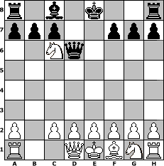 game notation in PGN-format [Event "°°°]^^[-Wilkommen im Jahr 2009-]^^[°°°"] [Site "www.myChess.de"] [Date "2009.01.03"] [Round "1"] [White "nogumo"] [Black "Knight"] [ECO "A00"] [WhitemyELO "1589"] [BlackmyELO "1120"] [Result "1-0"] [TimeControl "10/864000"] [WhiteDays "10"] [BlackDays "09"] [MyChessNo "51306"] 1. b4 e5 2. Bb2 Bxb4 3. Bxe5 Nf6 4. Nc3 d5 5. Bxf6 Qxf6 6. Nxd5 Qd6 7. Nxb4 Nc6 8. Nxc6 1-0 position notation in FEN-format r1b1k2r/ppp2ppp/2Nq4/8/8/8/P1PPPPPP/R2QKBNR - KQkq - 0 8 Captured white pieces: Captured black pieces: Click on a captured piece in order to display the desired move!