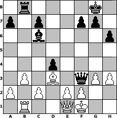 game notation in PGN-format [Event "3. Norderstedter DENK MAL Open 2012"] [Site "www.myChess.de"] [Date "2012.02.08"] [Round "1"] [White "UPS"] [Black "Schachfedi"] [ECO "C45"] [WhitemyELO "1625"] [BlackmyELO "1797"] [Result "0-1"] [TimeControl "10/2592000"] [WhiteDays "26"] [BlackDays "25"] [MyChessNo "79787"] 1. e4 e5 2. Nf3 Nc6 3. d4 exd4 4. Nxd4 Nf6 5. Nxc6 bxc6 6. Bd3 d5 7. exd5 cxd5 8. O-O Be7 9. Bg5 O-O 10. h3 Rb8 11. b3 Bb7 12. Nd2 h6 13. Bxf6 Bxf6 14. Rb1 Qd6 15. Nf3 Bc3 16. Kh1 Rfe8 17. Ne1 Bc6 18. Qg4 Rb4 19. Qd1 Qf6 20. g3 Bxe1 21. Rxe1 d4+ 22. Kg1 Rxe1+ 23. Qxe1 Qf3 24. Kf1 Rb8 0-1 position notation in FEN-format 1r4k1/p1p2pp1/2b4p/8/3p4/1P1B1qPP/P1P1PP2/1R2QK2 - - - 3 25 Captured white pieces: ![]() ![]() ![]() ![]() ![]() ![]() ![]() ![]() ![]() ![]() ![]() ![]() ![]() ![]() ![]() Captured black pieces: ![]() ![]() ![]() ![]() ![]() ![]() ![]() ![]() ![]() ![]() ![]() ![]() ![]() ![]() ![]() Click on a captured piece in order to display the desired move!